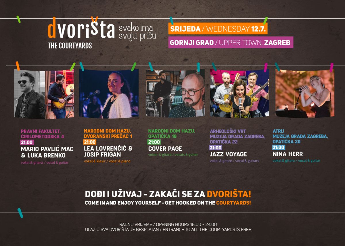 od srijede 12. srpnja počinje dobro poznata zagrebačka ljetna manifestacija „Dvorišta“ tijekom koje građani mogu zaviriti iza fasada nekih od najljepših zagrebačkih palača i doživjeti čarobne ambijente ovih jedinstvenih gornjogradskih prostora.