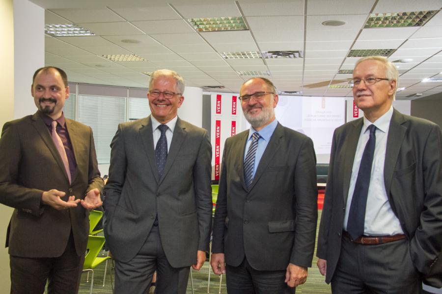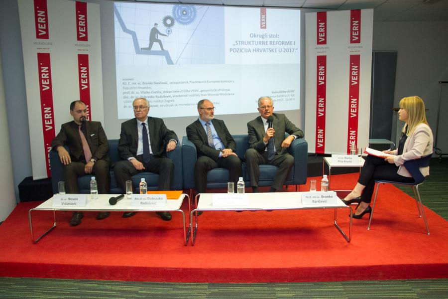 Na Veleučilištu VERN’ je održan okrugli stol pod nazivom „Strukturne reforme i pozicija Hrvatske u 2017.“ na kojem su sudjelovali NJ. E. mr. sc. Branko Baričević, veleposlanik i Voditelj Predstavništva Europske komisije u Republici Hrvatskoj, prof. dr. sc. Vlatko Cvrtila, dekan Veleučilišta VERN’ i geopolitički stručnjak, doc. dr. sc. Dubravko Radošević s Ekonomskog instituta Zagreb i akademski voditelj Jean Monnet Modula na VERN’u, te dr. sc. Neven Vidaković, stručnjak za monetarno-kreditnu politiku i predavač na Zagrebačkoj školi ekonomije i managementa.